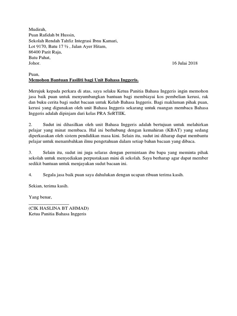 . Commend me to your daughter. Kami tak tahu puan. Sehubungan itu saya selaku Ketua Unit Persatuan Bahasa Inggeris SK Tarcisian Convent Ipoh dengan penuh harapan memohon sudilah apa kiranya puan mengesahkan penubuhan Persatuan Bahasa Inggeris SK Tarcisian Convent ini dan mendaftarkannya sebagai sebuah Pasukan Badan Kelab dalam bidang kokurikulum di sekolah ini berasaskan Peraturan.